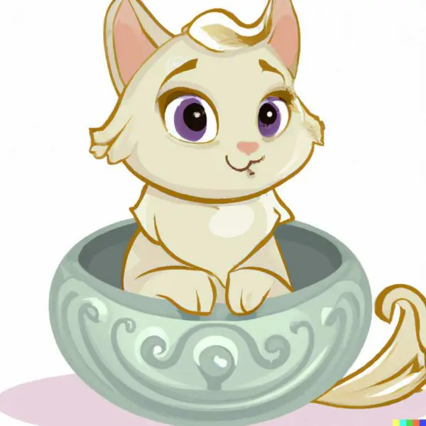 (little cat sitting in a bowl in vintage disney style)