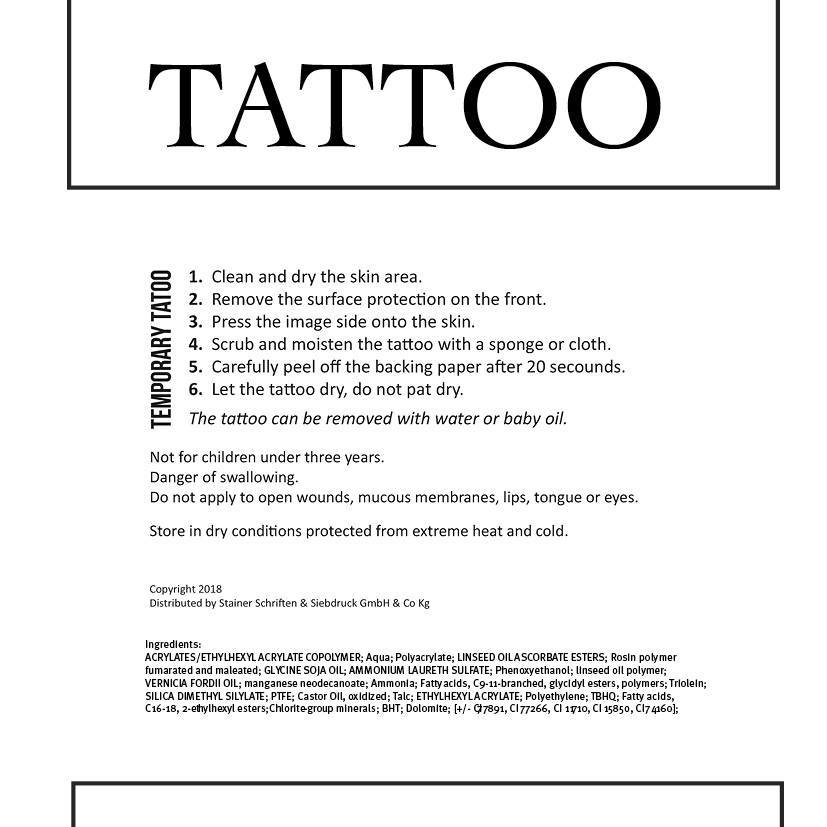 The required information is printed on the reverse side of the carrier paper on all our temporary tattoos.