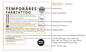Temporäre Tattoos gelten als kosmetische Artikel und müssen daher gesetzlich korrekt gekennzeichnet sein. Die erforderlichen Angaben werden bei allen unseren Klebetattoos auf die Rückseite des Trägerpapiers gedruckt.