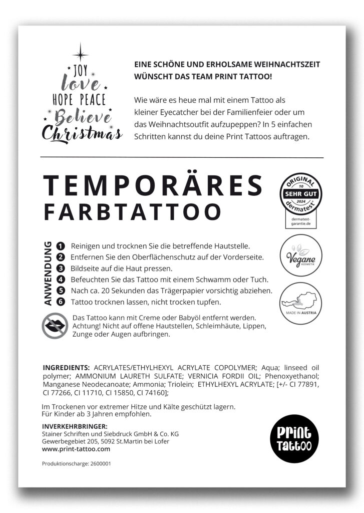 Du möchtest kreative Werbegeschenke für Weihnachten umsetzen, die Groß und Klein begeistern? Mit individuellen Print Tattoos wird das möglich! Gestalte süße Motive und lasse daraus Klebetattoos, Sticker oder ganze Sets fertigen. Diese lassen sich z.B. Aussendungen beilegen und können zum Basteln von Adventskalendern, zum Verzieren von Weihnachtskarten oder einfach als kleine Aufmerksamkeit eingesetzt werden.